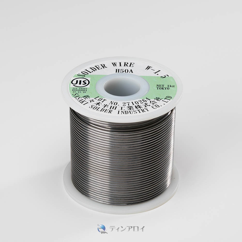 Sn50%Pb50%合金。ペンチ等で切断、自動添加等に使用。場所を取りません。融点 183℃ サイズ:1.5φ、1kg/巻