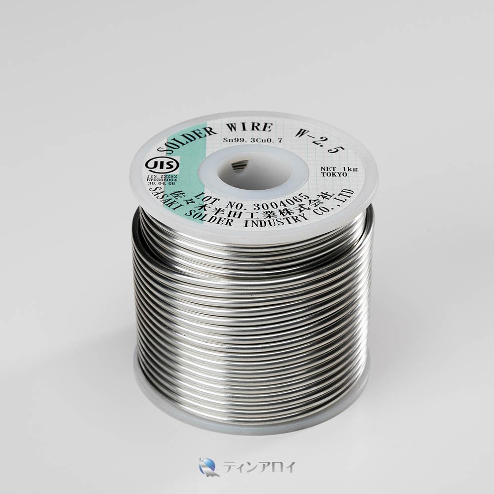 Sn99.3%Cu0.7%合金。ペンチ等で切断、自動添加等に使用。場所を取りません。融点 227℃ サイズ:2.5φ、1kg/巻