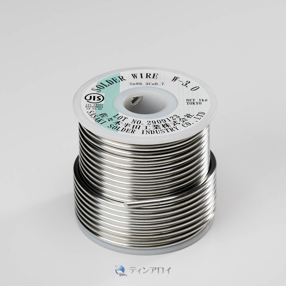 Sn99.3%Cu0.7%合金。ペンチ等で切断、自動添加等に使用。場所を取りません。融点 227℃ サイズ:3.0φ、1kg/巻