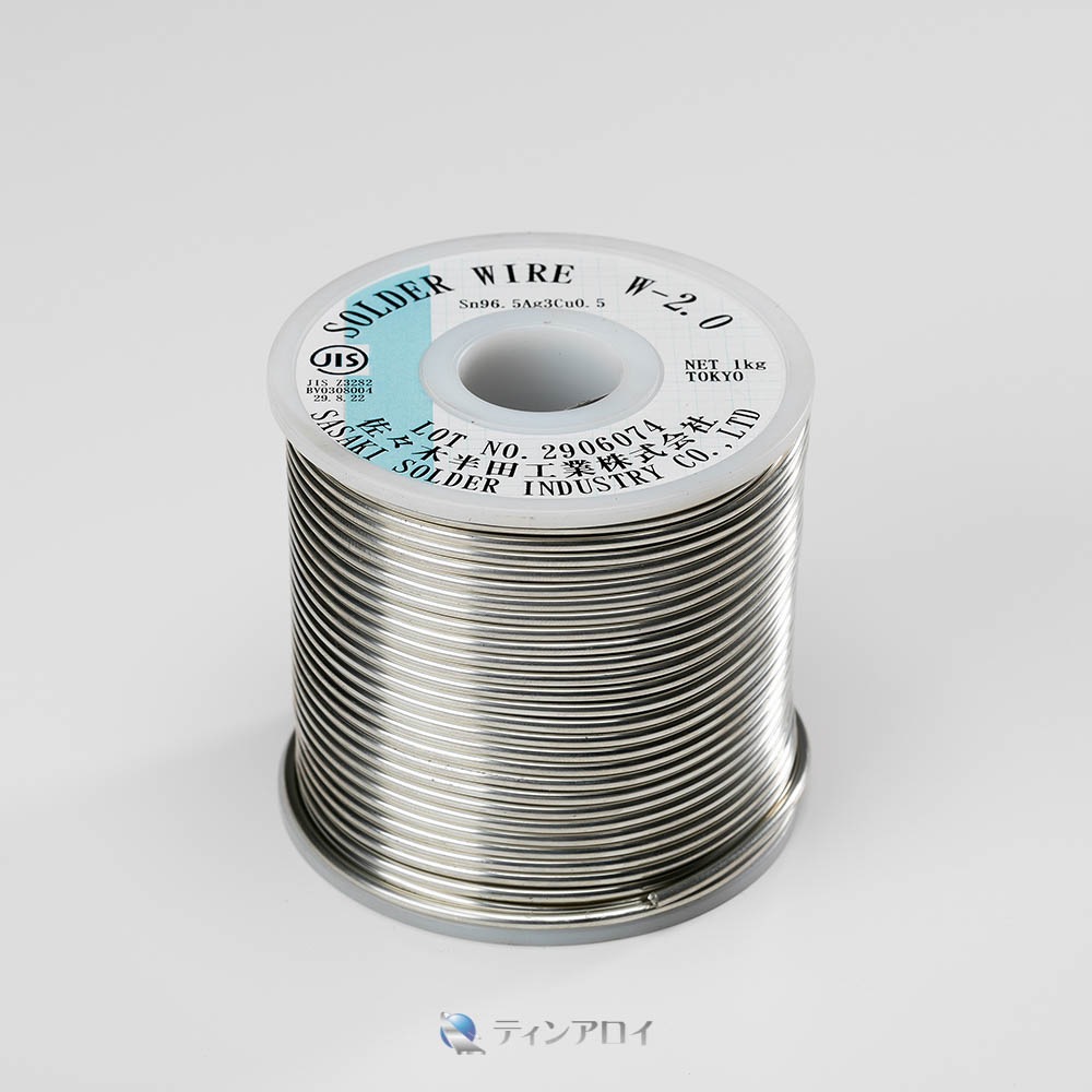 Sn96.5%Ag3%Cu0.5%合金。ペンチ等で切断、自動添加等に使用。場所を取りません。融点 217℃ サイズ:2.0φ、1kg/巻