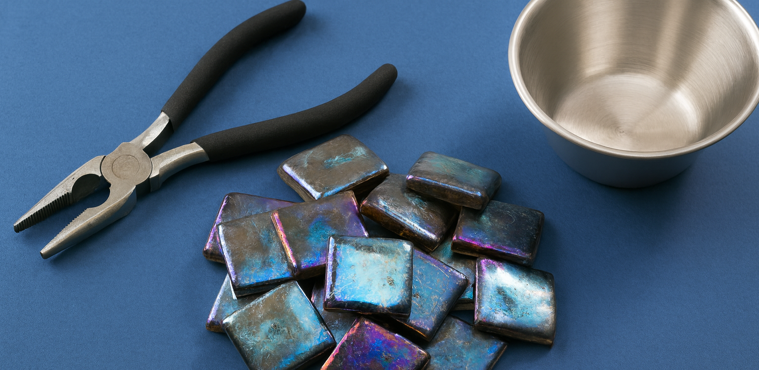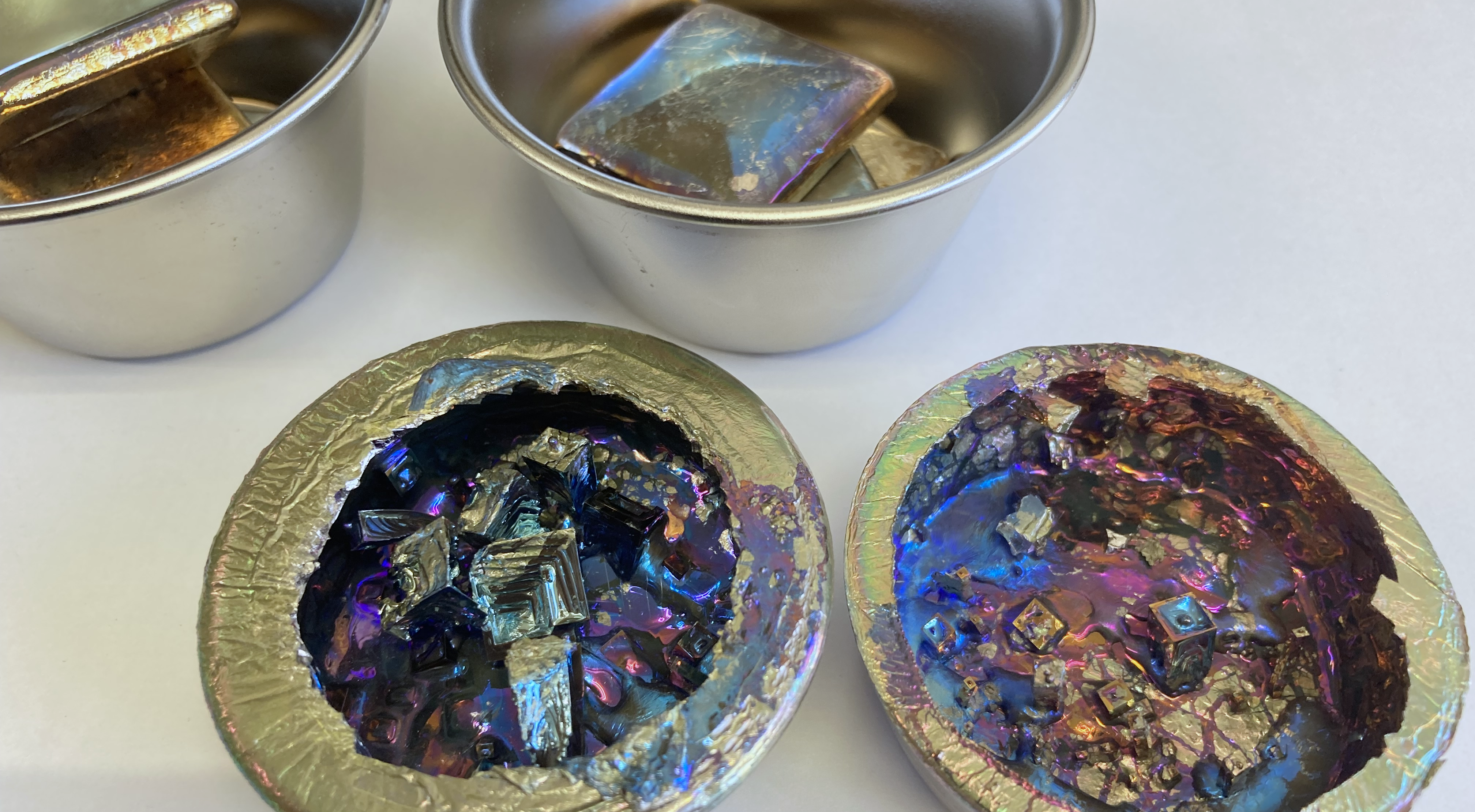 ビスマス結晶の作り方は2パターンあります。つまみ出して作る方法と、ステンレスカップなど容器の内側に結晶を作る方法です。 どちらも作業には危険が伴いますので、換気、服装には注意が必要です。ぜひ以下の「ビスマス結晶作り方」を参考にしてください。