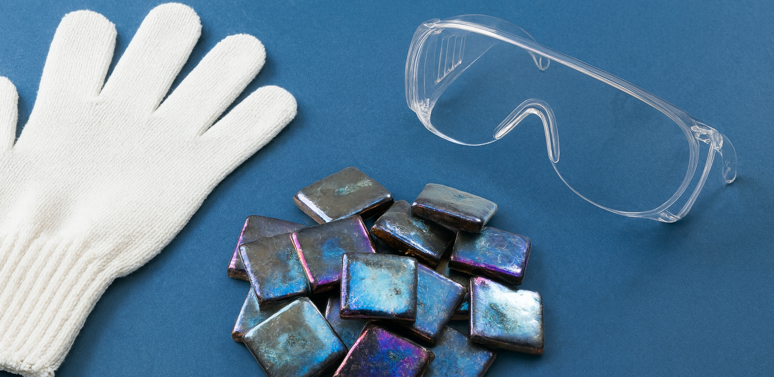 ビスマスは比較的低温で溶ける金属ですが溶けた状態は272℃飛び跳ねて皮膚に付着すると火傷してしまいますので念のため目を防護しましょう。手や足の肌の露出を避けて下さい。