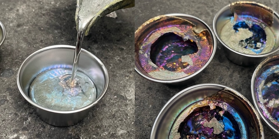 ティンアロイのビスマスチップを入れたステンレス製の鍋やボール、 ステンレス製のカップを火にかけます。